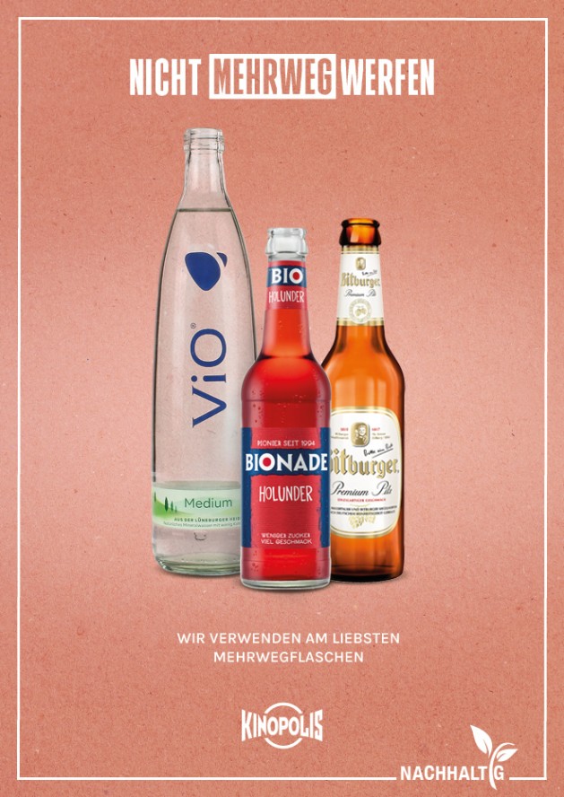 Durch den Einsatz von Mehrwegglasflaschen und Mehrwegbechern im Bereich der Süßwarentheke wird die Abfallmenge in den KINOPOLIS Kinos beträchtlich reduziert. Seit Juli 2021 werden in allen KINOPOLIS Kinos ausschließlich Mehrwegglasflaschen angeboten.